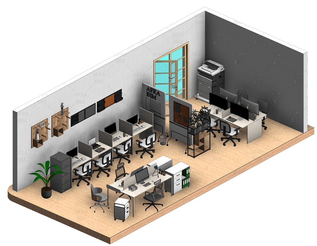 بیش از دهها آبجکت متنوع شامل میز، صندلی، کتابخانه، کاناپه، پارتیشن و تجهیزات اداری